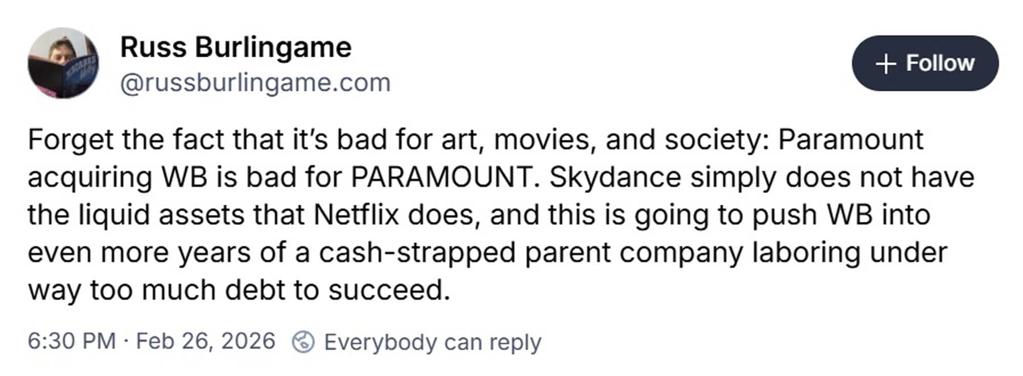 Paramount is now on the hook to pay Netflix’s $2.8 billion break-up fee on behalf of Warners, and Netflix’s stock rose by over 10% on the news they will not be acquiring WBD. So, not merging has been good for Netflix’s business (the stock market is fake and a scam, argue with a wall). But will it be good for Paramount and Warners?