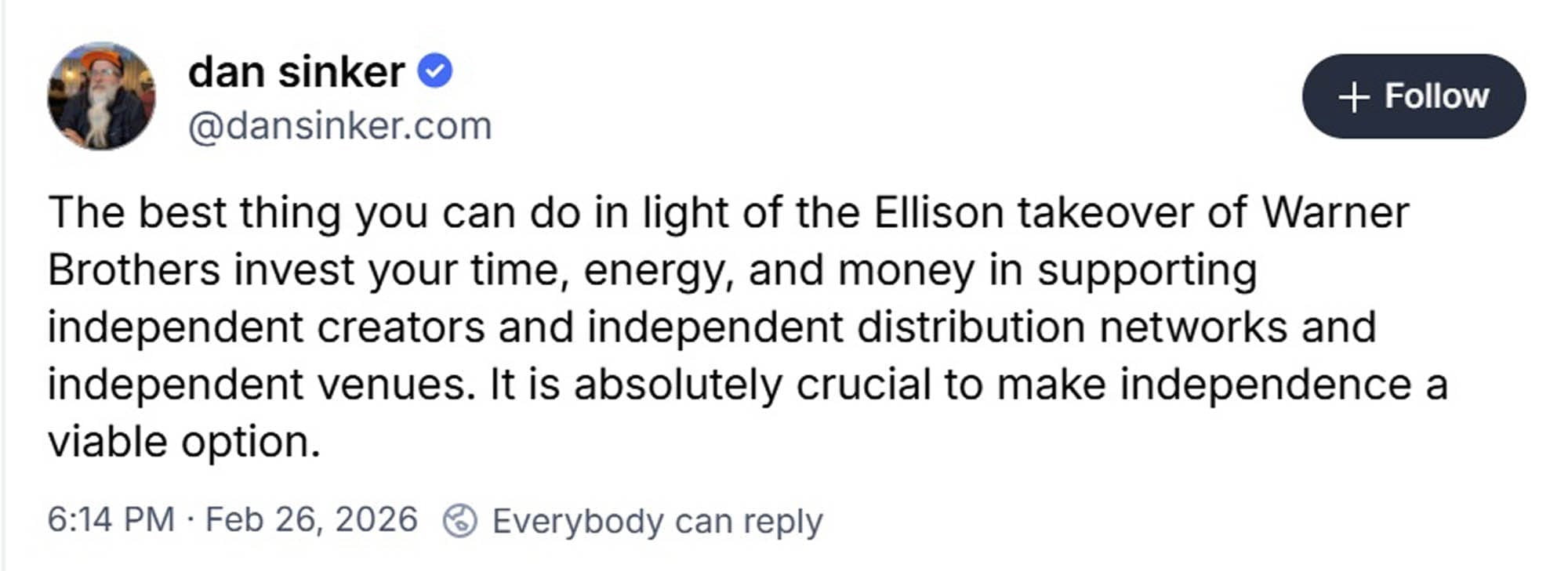 It really feels like we’re witnessing the slow death of Hollywood, that we’re letting billionaires squeeze the life out of a great American art form. The studio system has collapsed before, but previously that was driven by demands coming from within the industry itself, either by changing technological or labor needs. Now it’s coming from trust fund babies who don’t have enough hobbies to keep them away from the rest of us. Why couldn’t David Ellison get super into yacht racing? Or collecting antique watches? These billionaires are raising boring ass kids and we’re all paying for it.