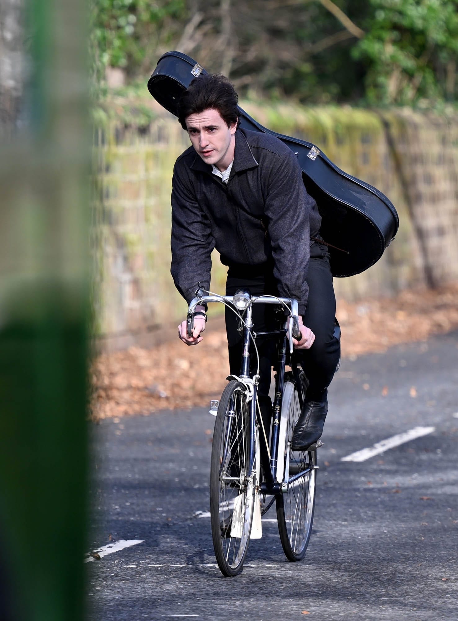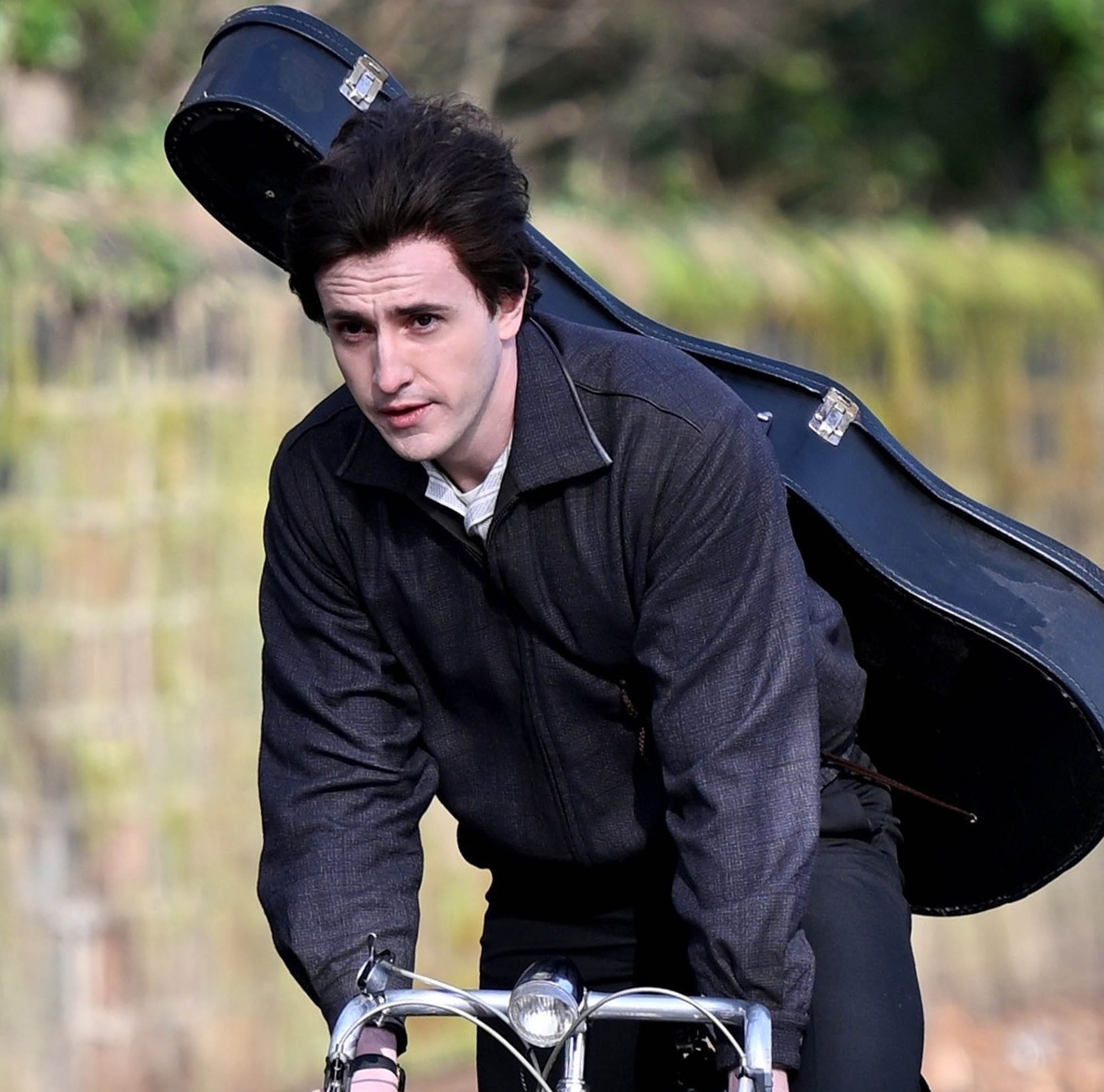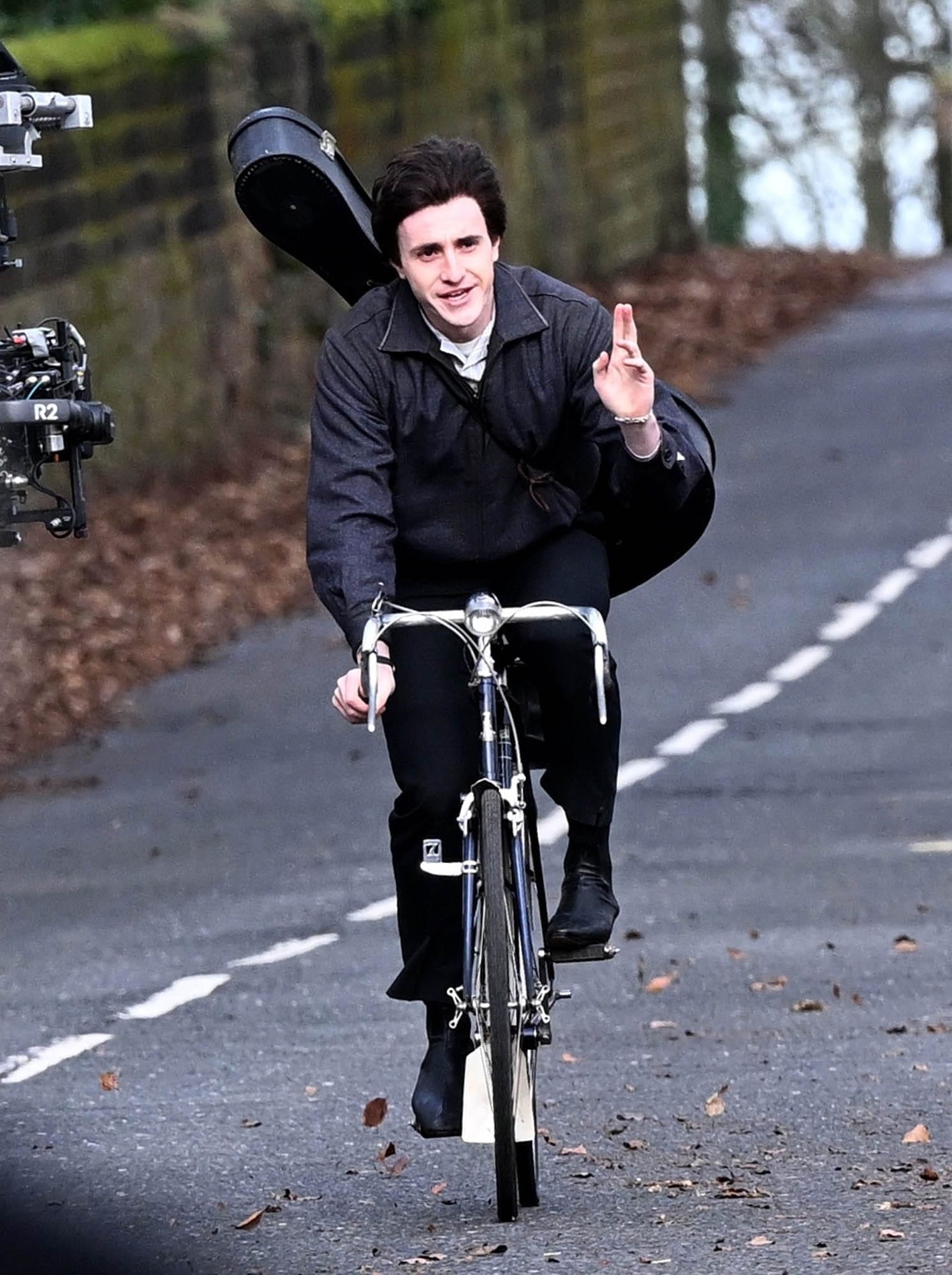 Paul Mescal was seen on the set of one of Sam Mendes’s four Beatles biopics today in Liverpool, shooting a scene involving Paul McCartney on a bike with his guitar on his back. And wearing a dark brown wig that’s obviously a wig – that hairline, LOL – but is also holding up well in the wind. The colour is a giveaway too, the shade looks right out of the box. Curious to see how this will read in theatres.