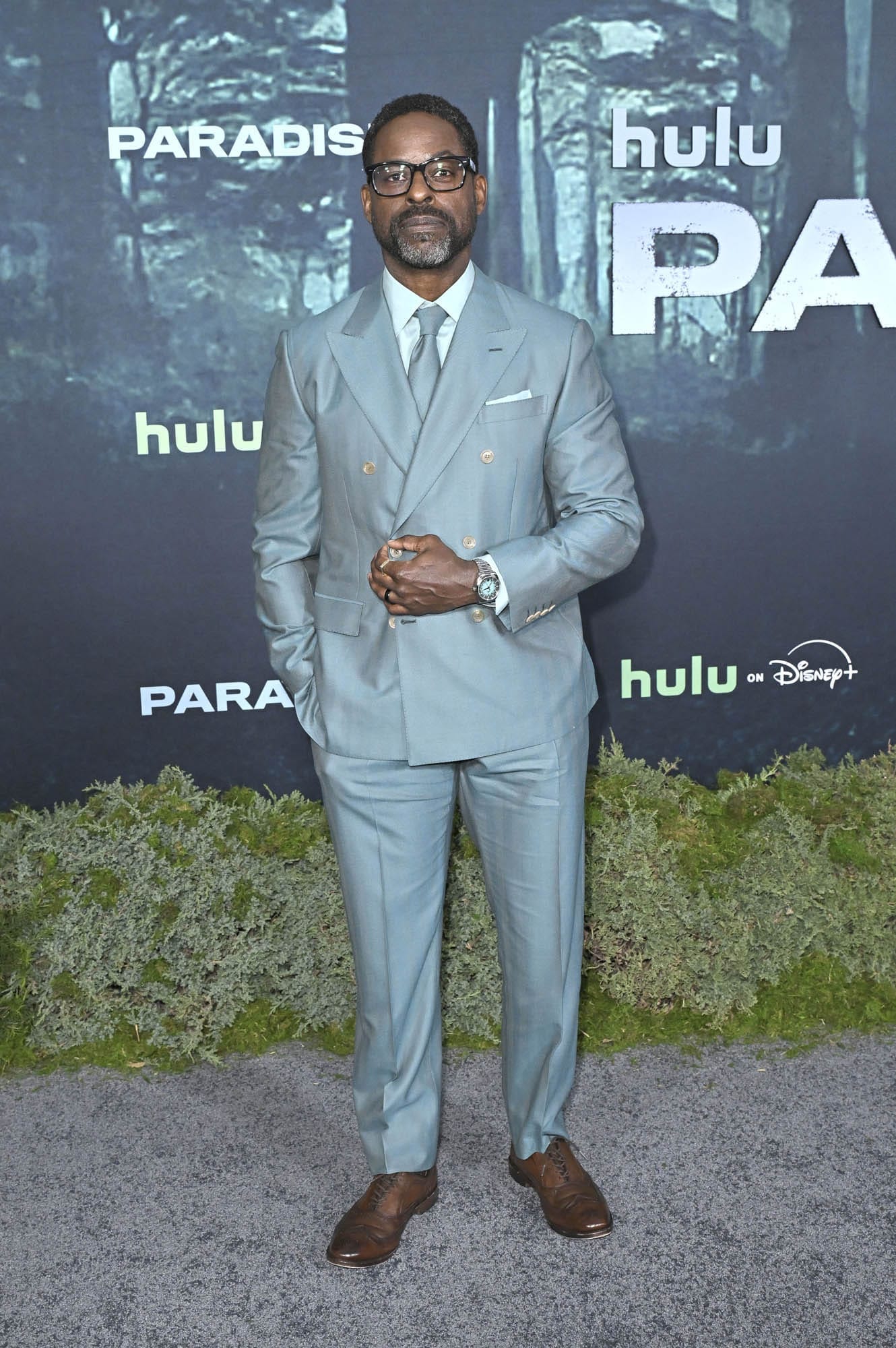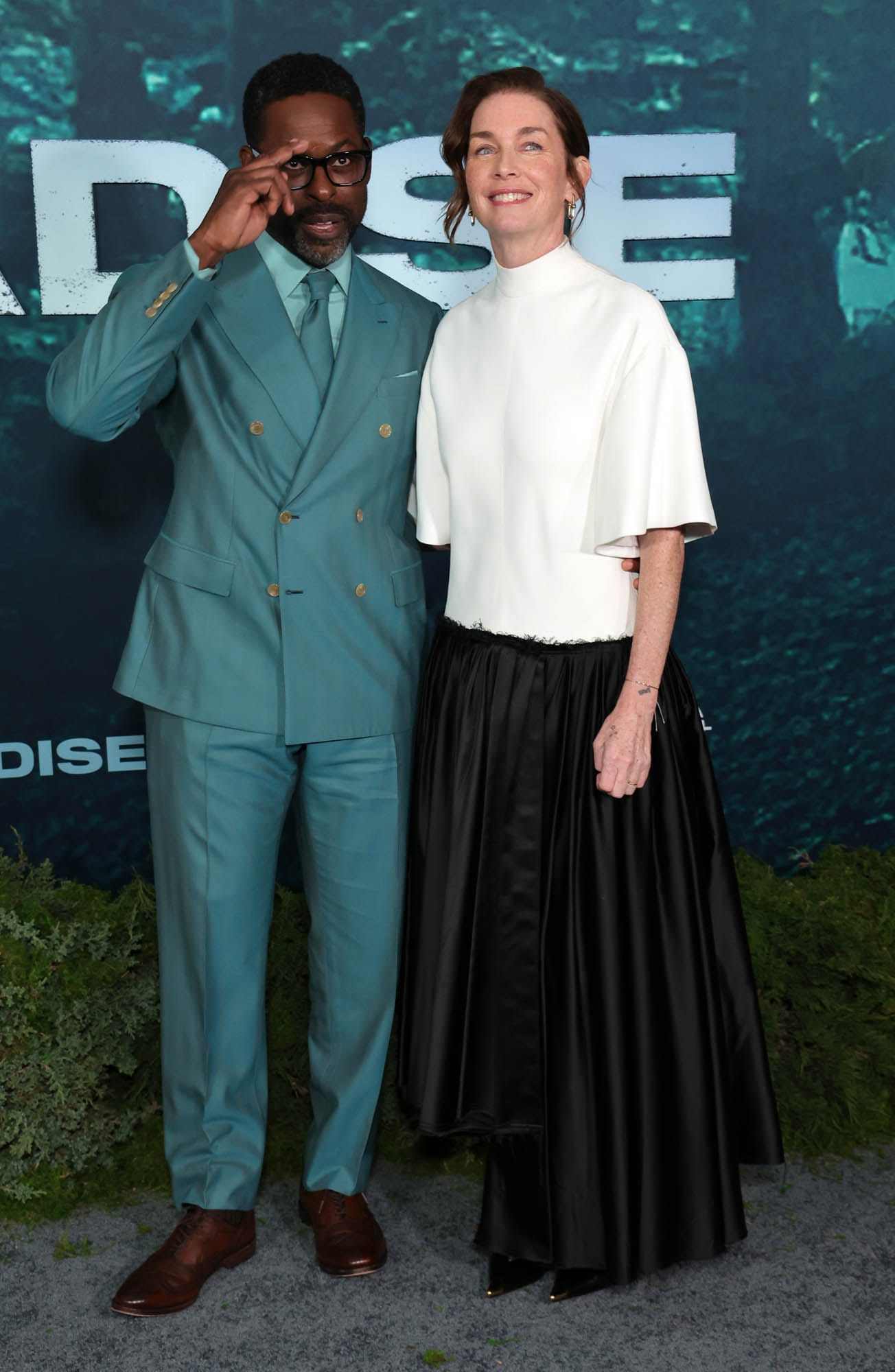 Matching your outfit to the background doesn’t work out for everyone… but it’s working for Sterling K Brown, in teal last night at the premiere of Paradise season two, streaming on February 23. I mean, it looks like teal to me, you might call it something else. But the point is it’s coordinated with the poster and I don’t hate it. First of all, it’s just such a fresh shade. And the monochrome of the whole look makes it even fresher.